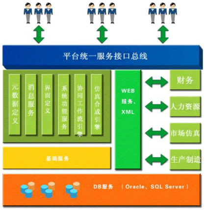 金蝶企业运营电子对抗平台运用先进的计算机软件与网络技术,产品实现了多项创新。整个系统架构包括三部分:数据处理应用服务器、仿真控制与分析客户端、仿真决策与分析客户端。两个客户端通过网络集中连接到数据处理应用服务器上,通过远程调用服务器开放的标准化对象与接口实现仿真管理运营决策过程。