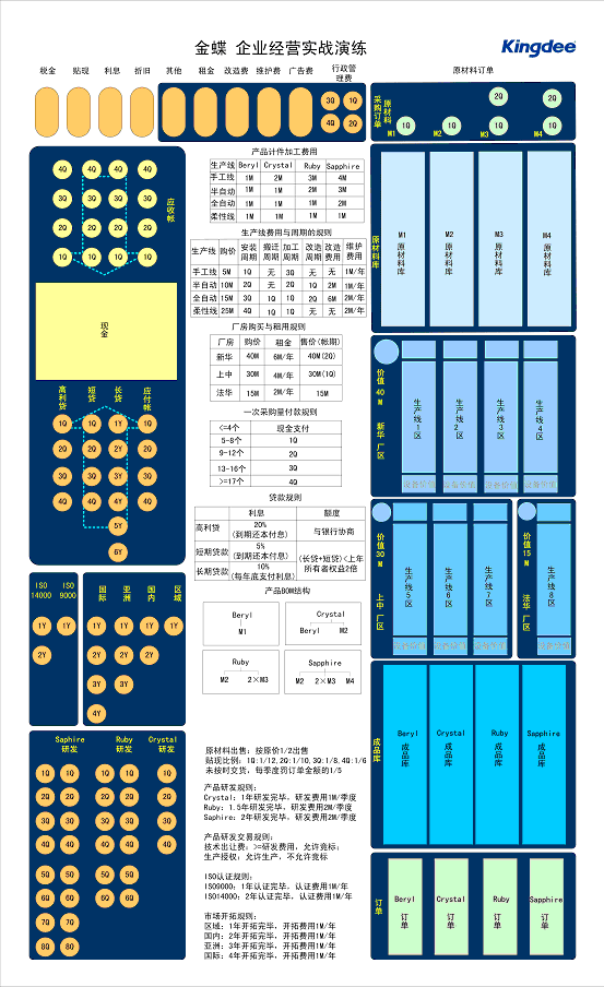 ERP模拟对抗课程的基础背景设定为一家已经经营若干年的生产型企业,此课程将把参加训练的学员分成4-6组,每组4-5人,每组各代表不同的一个虚拟公司,在这个训练中,每个小组的成员将分别担任公司中的重要职位(CEO、CFO、市场总监、生产总监等),每队要亲自经营一家拥有1亿资产的销售良好,资金充裕企业,连续从事6至8个会计年度的经营活动,从中但面对同行竞争对手、产品老化、市场单一化,公司要如何保持成功及不断的成长是每位成员面临的重大挑战。该课程涉及整体战略、产品研发、设备投资改造、生产能力规划与排程、物料需求计划、资金需求规划、市场与销售、财务经济指标分析、团队沟通与建设等多个方面。