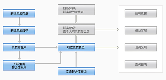能力素质模型是对员工核心能力进行不同类别、不同层次的定义以及相应的行为描述,确定关键能力和完成特定工作所需求的熟练程度。主要功能包括素质指标库、职位素质模型、素质符合度查询、能力素质测评。