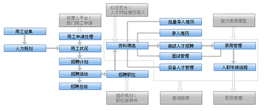 招聘选拔系统以公司的人力资源规划为基础,以职位的任职资格和能力素质为依据,制定具体的招聘计划和开展招聘流程。