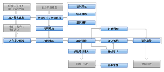 培训发展以提高员工素质、发掘员工潜力为目的,推动企业核心能力的提升。主要功能包括培训体系、培训规划、培训活动管理、培训记录、培训总结、问卷调查等。