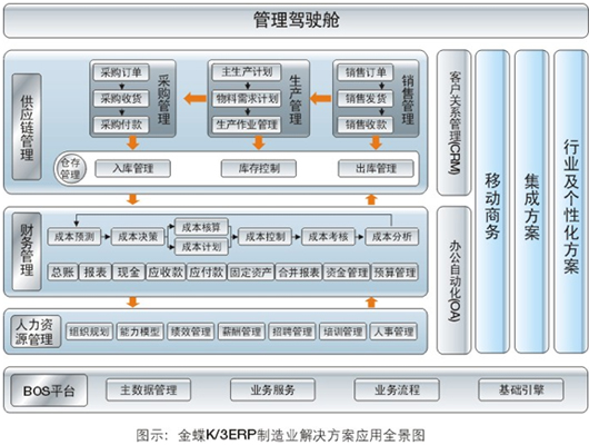 金蝶K/3 ERP系统集供应链管理、财务管理、人力资源管理、客户关系管理、办公自动化、商业分析、移动商务、集成接口及行业插件等业务管理组件为一体,以成本管理为目标,计划与流程控制为主线,通过对成本目标及责任进行考核激励,推动管理者应用ERP等先进的管理模式和工具,建立企业人、财、物、产、供、销科学完整的管理体系。
