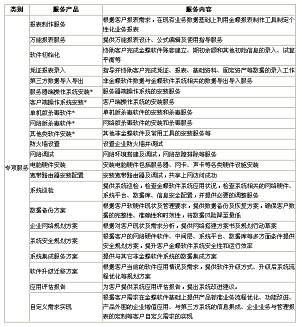 对于ERP软件应用较复杂的大中型客户,除常规标准服务需求外,还有很多其他的软件服务需求,客户可以根据自身服务需求选择合适的专项服务。专项服务包括:报表制作、万能报表、软件初始化、凭证报表录入等非常规软件服务支持,服务器或客户端软件安装、网络或硬件维护等IT服务支持,数据备份方案、网络规划方案、安全规划方案等方案支持。