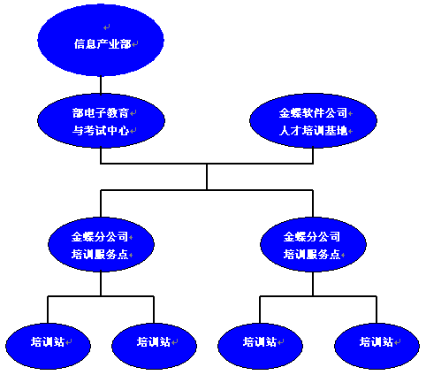 金蝶公司作为“全国信息技术人才培训基地”,可将金蝶授权培训中心(KATC)及合作院校(具备金蝶ERP实验室且计划开展本项目)发展为培训站承担具体培训工作,以金蝶现有的培训服务体系为服务中心,在金蝶各分支机构设立培训服务点,具体负责各培训站培训认证业务的指导和组织协调工作。通过与政府主管部门和国内外专业机构的合作,向培训站和受教育者提供人才服务,包括人才数据库、实习就业推荐、技能考核和职业咨询指导。