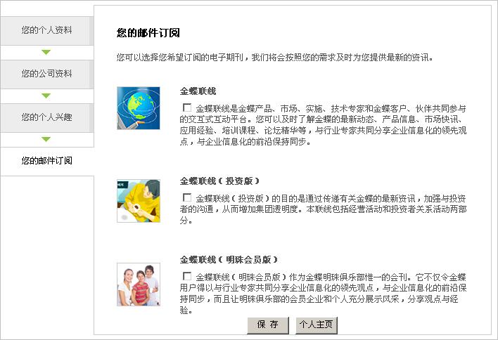 点击“您的邮件订阅”标签,进入邮件订阅修改页面,从页面上列出的几类邮件订阅中选择您感兴趣的几类,点击“保存”即可。如下图: