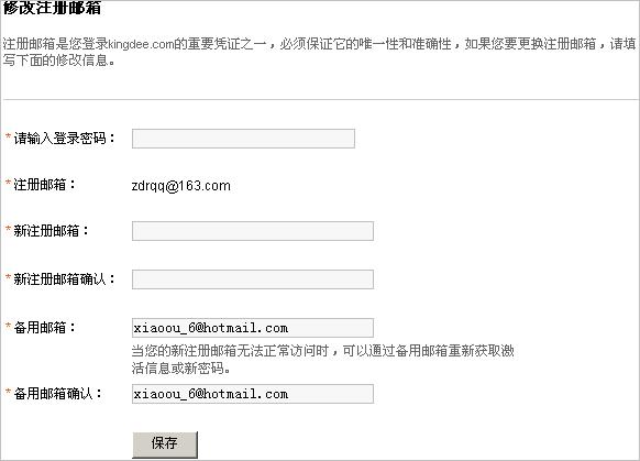 如果您的邮箱有变动,需要修改,那么请点击“金蝶会员中心”首页右上角的“修改注册邮箱”链接,进入注册邮箱修改页面,如下图所示: